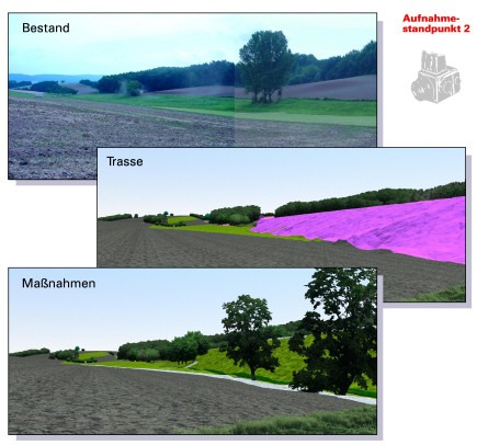 Im Rahmen eines F+E-Forschungsvorhabens der Universität Potsdam wurden die zum Zeitpunkt der Projektrealisierung vorhandenen Möglichkeiten untersucht, unter Verwendung digitaler Daten, Photos und Luftbilder ein Landschaftsbild zu visualisieren. Unter Verwendung eines Landschaftsgenerators (WCS: World Construction Set)) wurden realisitische Landschaftsbilder (auch aus Fußgängerperspektive) generiert. Grundlage der Visualisierung sind Nutzungsdaten aus dem GIS, die mit geeigneten Texturen belegt und bei Bedarf mit 3D-Objekten ergänzt werden. Nach dem einmaligen Projektaufbau in WCS können relativ schnell Varianten zu einem Standort visualisiert werden. Interaktive Eingaben zu Standort und Blickwinkel ermöglichen die Beurteilung der räumlichen Wirkung von Eingriff und Maßnahmen aus unterschiedlichen Perspektiven. Im Einzelnen wurde an festgelegten Standpunkten die Wirkung von Straßenbau-Vorhaben sowie von Ausgleichs- und Ersatzmaßnahmen auf das Landschaftsbild untersucht. Dabei wurden sowohl für Planungsalternativen als auch für Zeitreihen innerhalb einer Variante (wachsende Bäume) Visualisierungen generiert.